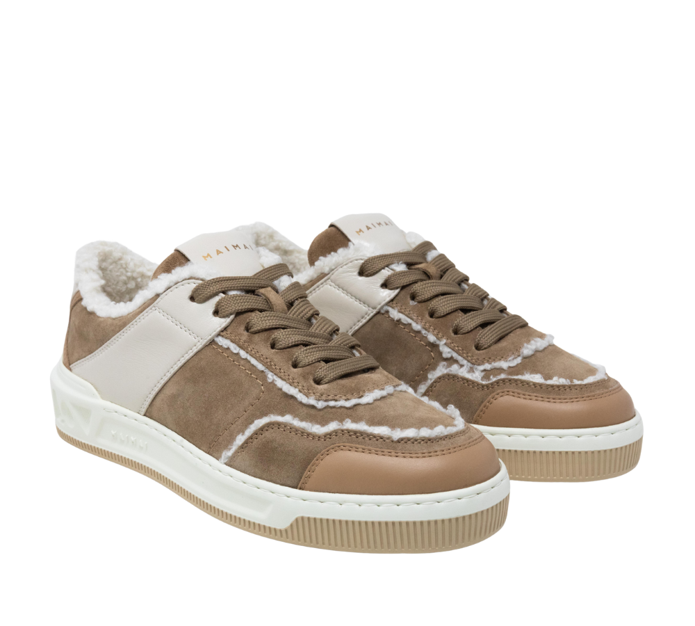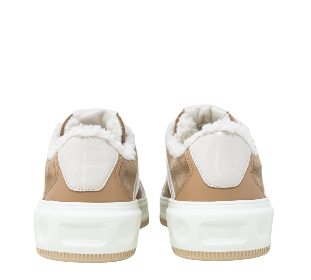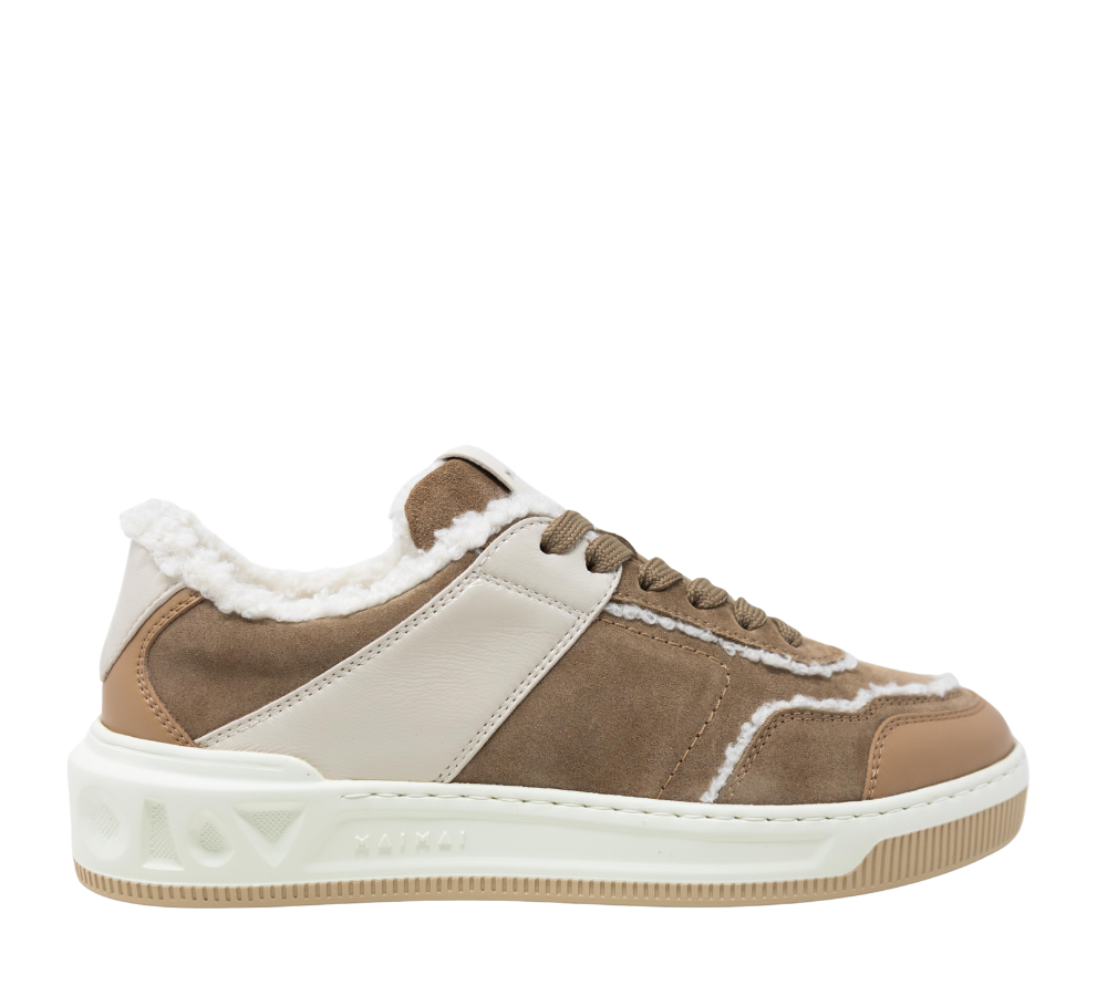 Realizzata in suede pregiato con fodera in eco montone, avvolge il piede con calore e leggerezza. Lo shirling sulla tomaia lascia intravedere il montoncino dalle cuciture, creando un dettaglio unico e raffinato che gioca con texture e volumi.