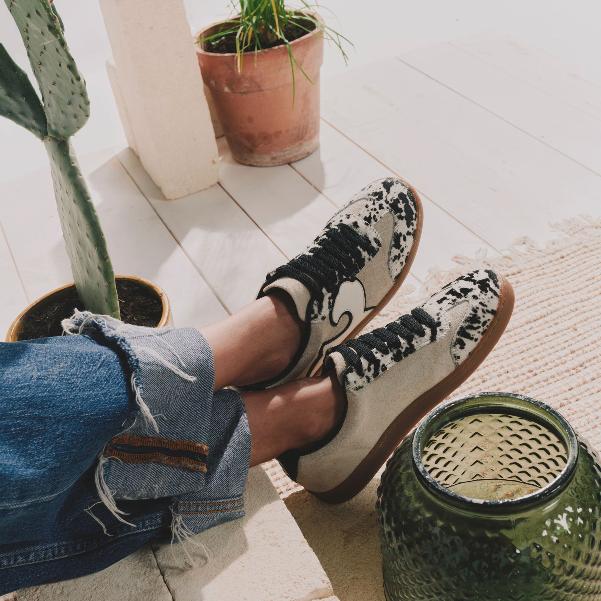 - Tomaia: suede, nappa e pelo di bovino stampato;