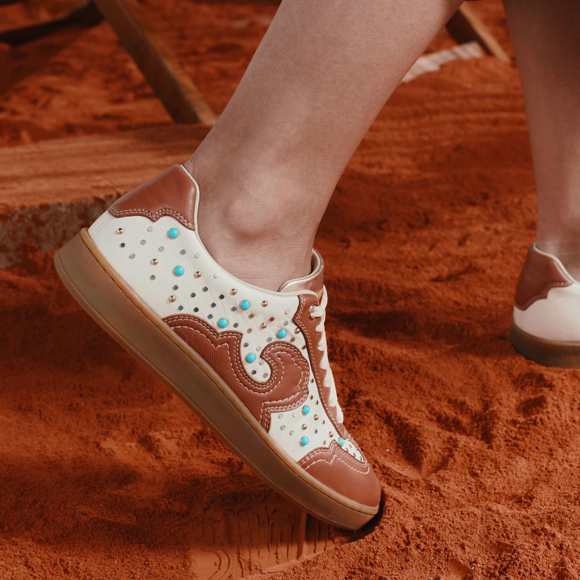 - Tomaia: nappa con ricami e applicazioni in metallo e madre perla per un effetto texano;