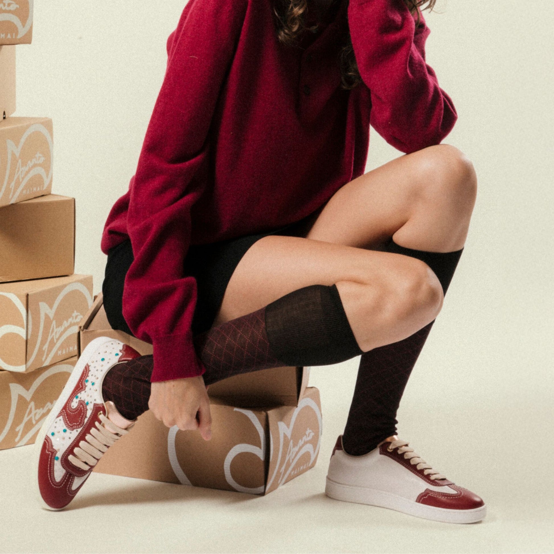 Realizzata interamente in morbida nappa, la sneaker è caratterizzata da doppie cuciture che richiamano lo stile dei texani e da borchie di forme diverse che decorano il lato esterno, creando un gioco di dettagli unico e distintivo.